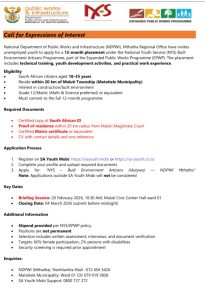 The National Department of Public Works & Infrastructure is offering a 12‑month NYS Built Environment Artisans programme near Maluti. Apply via SA Youth Mobi before 04 March 2026 for technical training, youth development & work experience. #YouthOpportunity